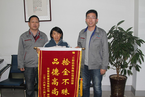 12月12日上午,宋玉華將一面印有“拾金不昧,品德高尚”的錦旗送到了公司項目部。郭永林同志拾金不昧的行為,充分體現(xiàn)了三陽員工高尚的道德情操和精神面貌,他用自己拾金不昧的實際行動展現(xiàn)了我們?nèi)柸藘?yōu)秀的個人品質(zhì),為公司贏得了良好的聲譽。