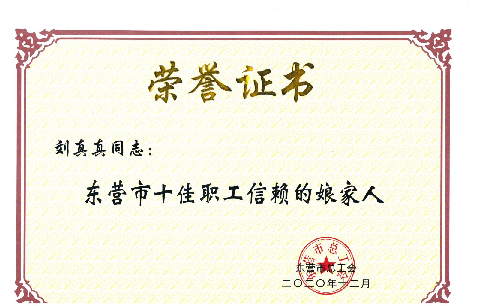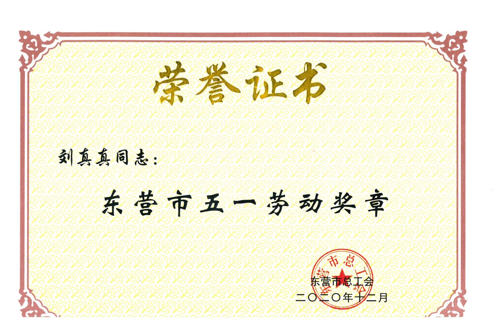 近日,東營市總工會在全市開展了東營市五一勞動獎評選活動中。我公司工會劉真真同志先后榮獲“東營市五一勞動獎?wù)?rdquo;、“東營市十佳職工信賴的娘家人”榮譽稱號。