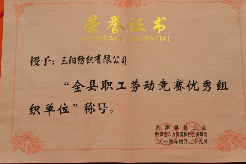在會上,三陽公司榮獲“全縣職工勞動競賽優(yōu)秀組織單位”、織造分公司榮獲“利津縣工人先鋒號”稱號、公司技術(shù)總監(jiān)劉虎城榮獲“全縣職工勞動競賽優(yōu)秀組織者”榮譽稱號。